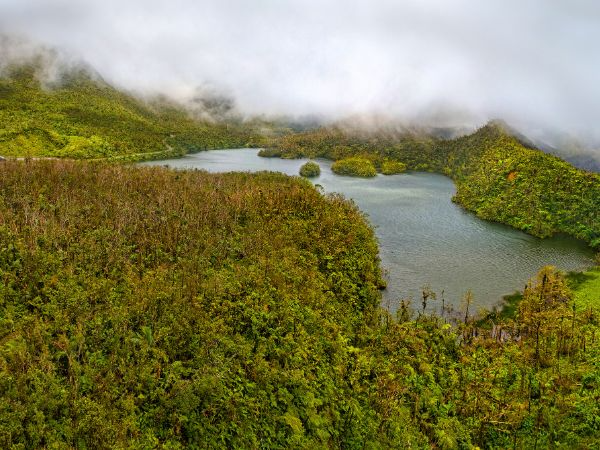 Located high in the mountains above Laudat, Freshwater Lake is the largest lake in Dominica. The circular trail around the lake offers cool breezes and sweeping views of the surrounding hills. It usually takes one and a half to two hours to walk the loop, and it is rated moderate in difficulty. The drive from Roseau to Freshwater Lake takes about half an hour.